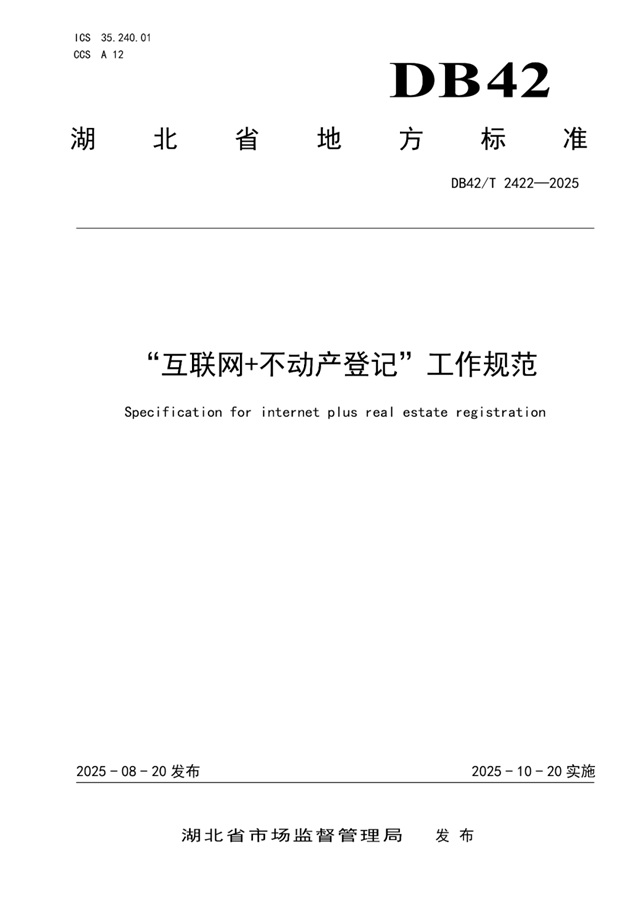 2025年10月20日,由湖北省地理国情监测中心(湖北省自然资源厅不动产登记中心)、武汉市不动产登记中心、武汉大学、湖北省标准化与质量研究院、长江水利委员会长江科学院联合编写的《“互联网+不动产登记”工作规范》(DB42/T2422-2025)湖北省地方标准正式颁布实施。